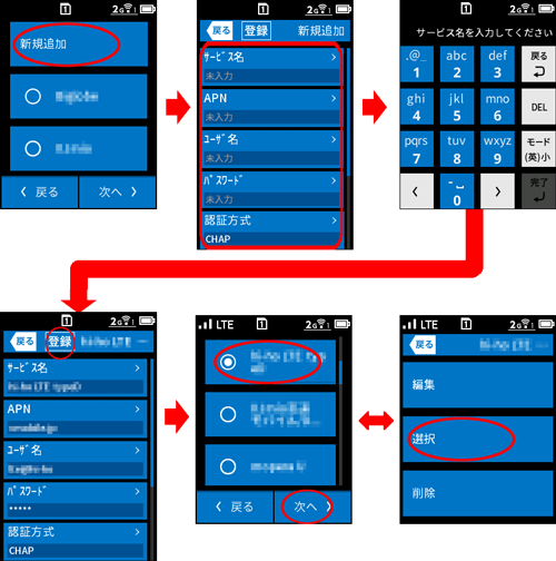 ご契約の通信事業者からの情報にしたがって「サービス名」「APN」「ユーザ名」「パスワード」「認証方式」を手入力し、[登録]をタップします。その後、登録した接続先を選択(タップ)します。