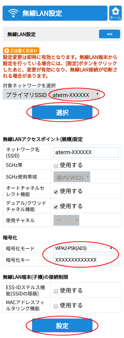 「プライマリSSID」または「セカンダリSSID」を選択し、「選択」ボタンをクリックします。
