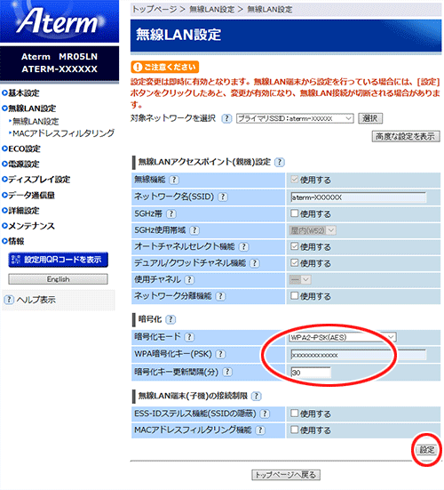 ※ 「使用する」のチェックを外すと、無線機能すべて(プライマリSSID/セカンダリSSIDの両方)が停止します。