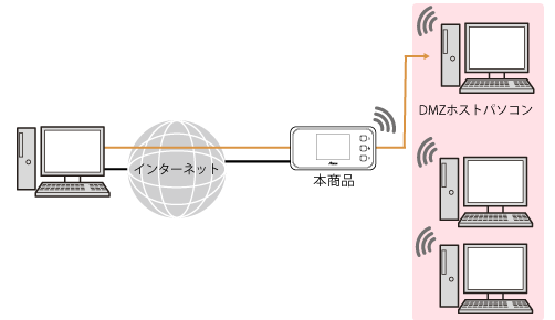 ※ DMZホストを設定していないLAN側ホストには、本商品のアドバンスドNAT機能がはたらき外部からの接続は受け付けない設定になっています。