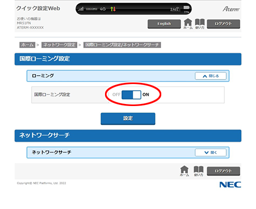 国際ローミング機能を有効(ON)にすることで、国際ローミングサービス(日本国内の通信事業者契約のSIMを海外で使う)を利用できます。