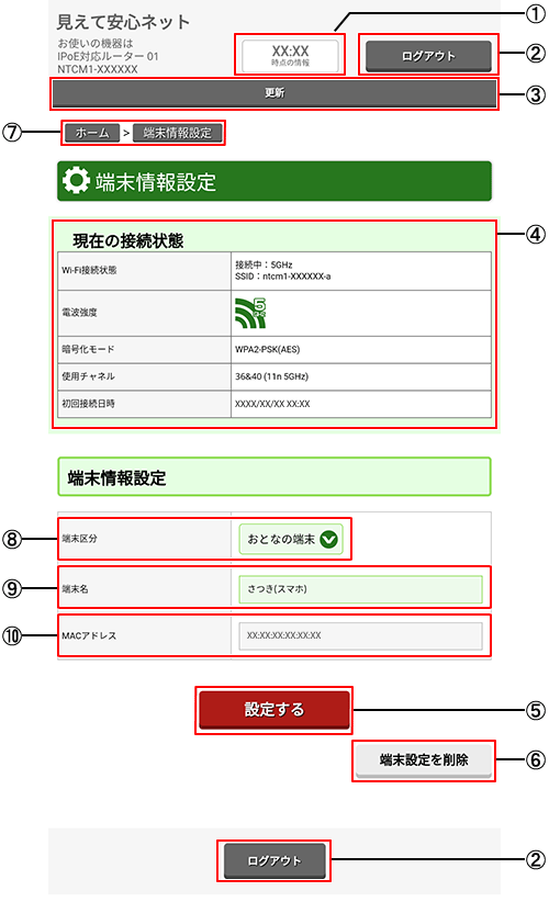 - ⑩ 端末のMACアドレスを表示します。