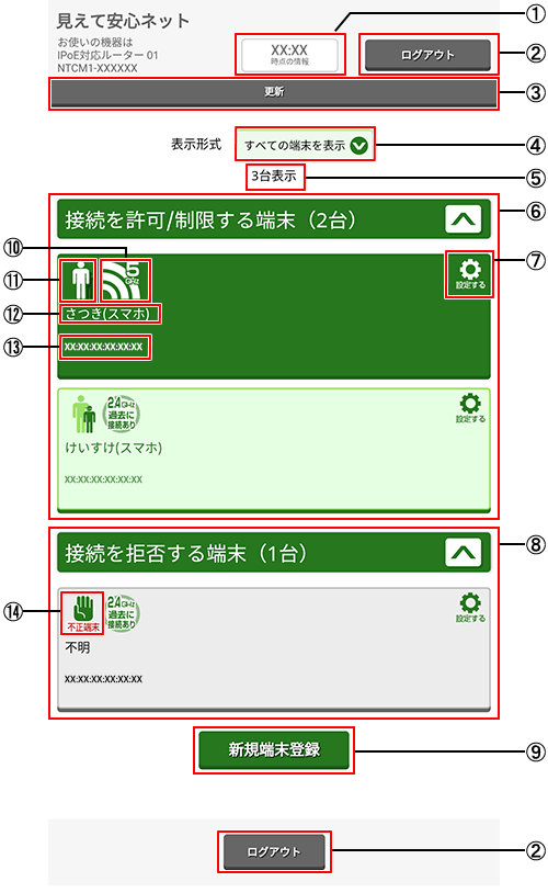 - ⑥ 接続を許可/制限する端末(台数)を表示します。