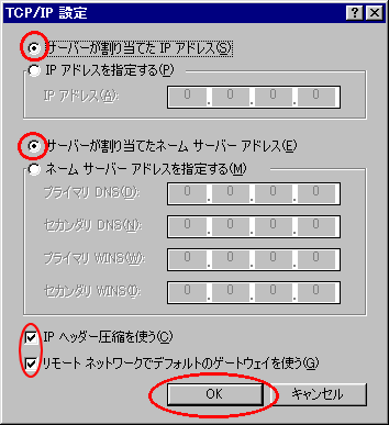 サーバーアドレス]、[IPヘッダー圧縮を使う]、[リモートネットワークでデフォルトの