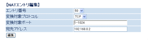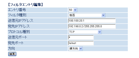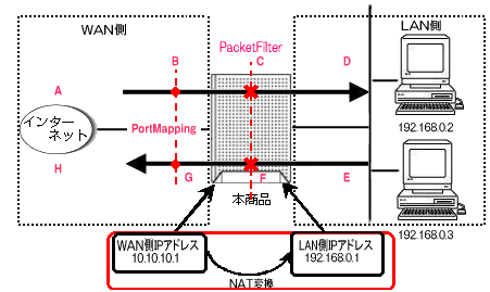 ポートマッピングとパケットフィルタを組み合わせることにより、以下のような設定を行うことができます。 以下の全てのWAN側IPアドレス(10.10.10.1)や送信元IPアドレス(100.100.20.1)は例です。 WAN側IPアドレスは、本商品に割り当てられたグローバルIPアドレスを設定しています。 送信元アドレスは、インターネット側からアクセスしてくる端末のグローバルIPアドレスを設定 しています。 WAN側IPアドレスは、ADSL接続事業者またはプロバイダから割り当てられたIPアドレスを入力して ください。 ※設定したWAN側IPアドレスは、「現在の状態(表示モード:拡張)」−「接続先1〜接続先5 [接続設定1 〜接続設定5] 状態」のWAN側IPアドレスで確認することができます。 |