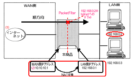 | ■1-1024番ポート宛のパケットをパソコン(192.168.0.2)に通す。ただし、23番(telnet)ポート 宛のパケットは通したくない場合 |