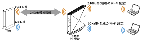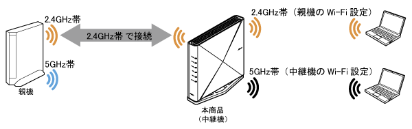 親機と中継機(本商品)間、中継機(本商品)と子機間ともに2.4GHz帯で通信します。