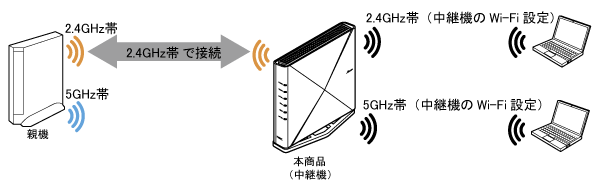 中継機(本商品)と子機間は、5GHz帯通信と2.4GHz帯通信の両方を同時に使用することができます。子機は、5GHz帯のネットワークか2.4GHz帯のネットワークを選択して接続することができます。