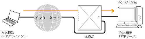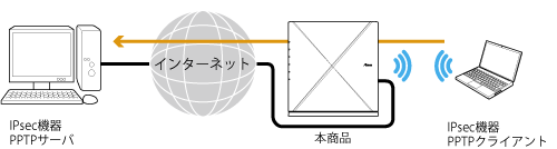 IPsecまたはPPTPによるVPN接続を使用することにより、インターネットを経由してLAN側のIPsec機器/PPTPクライアントからWAN側のIPsec機器/PPTPサーバにアクセスすることができます。また、本商品の動作モードがPPPoEルータモードまたはローカルルータモードの場合は、WAN側のIPsec機器/PPTPクライアントからLAN側のIPsec機器/PPTPサーバにアクセスするように設定することも可能です。