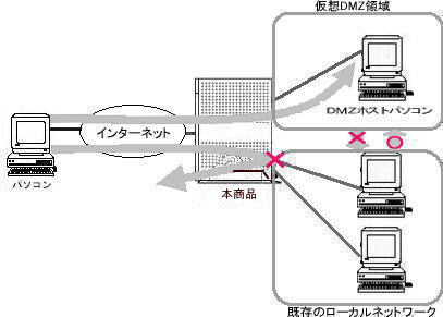 (インターネット)からも内部(LAN)からも隔離された領域のことを言います。 本商品では、仮想的にDMZ領域を作り、外部からアクセスされるDNSサーバ、 メールサーバ、Webサーバなどを仮想DMZ領域に配置する ことで、既存のLANに対してセキュリティを確保する機能を提供しています。 本商品のDMZホスティング機能は、これらの機能を組み合わせることにより、 お客様のパソコンをより安全に保つことができます。 ただし、DMZホスティング機能を、利用しても完全に被害をなくすことが できることを保証するものではありません。 被害を最小限に止めるための機能とご理解いただきご使用ください。 | ||||||||||||||||||||