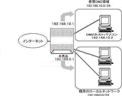 DMZ機能はさまざまな目的に使用することが可能です。 ここでは初期状態(工場出荷状態)のネットワークに下図のようなサーバ (DMZホストパソコン)を設置する方法を説明します。 <ご参考> 既存のローカルネットワークは、192.168.0.0/24 、DHCPサーバ機能および IPマスカレード機能使用となっています。 IPマスカレードを使用しているネットワークは、外部から接続できません。 よって既存のローカルネットワークは外部からの意図しないアクセスを 受けることはありません。 また仮想DMZでは、DNSサーバ、メールサーバ、Webサーバなどの複数のサーバを 仮想DMZ領域に設置する場合にはポートマッピングを設定します。 さらにDMZホスティング機能は、IPパケットフィルタリングの設定もあわせて 設定すると、より安全な状態でご利用いただけます。 <設定例> 設定可能範囲は、下記の通りです。
