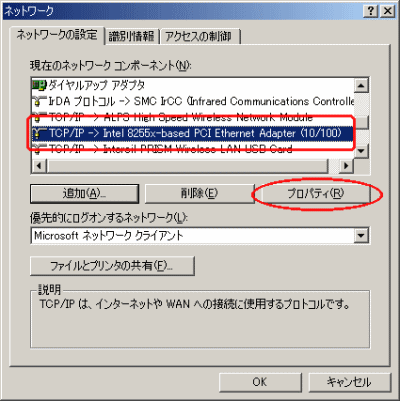 リストの中の[TCP/IP->(ネットワークアダプタの名称)]を選択し、[プロパティ]を