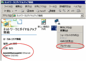 [ローカルエリア接続]を右クリックし、[プロパティ]を選択する |