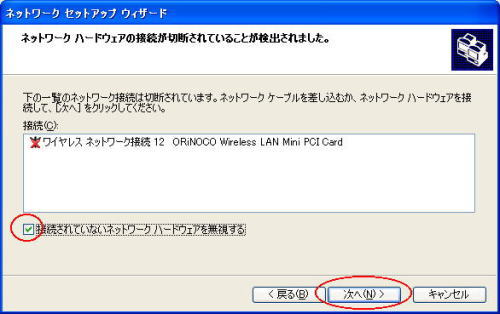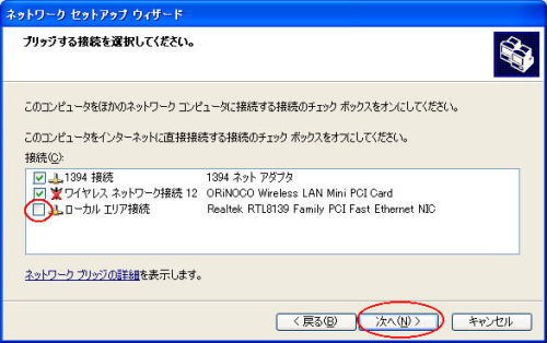 接続するアダプタのチェックを外し、[次へ]をクリックする |