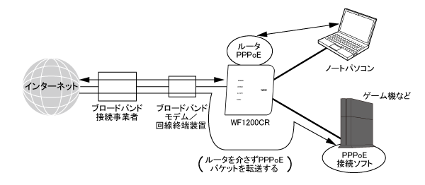 パソコンやゲーム機などでPPPoE(PPP over Ethernet)プロトコルの利用が必要な場合やグローバルIPアドレスが必要なアプリケーションを利用する場合は、PPPoEブリッジ機能を使用して、接続できます。