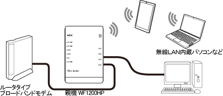 ルータタイプブロードバンドモデムにWi-Fi機能がない場合にもスマートフォンなどが接続できます。
