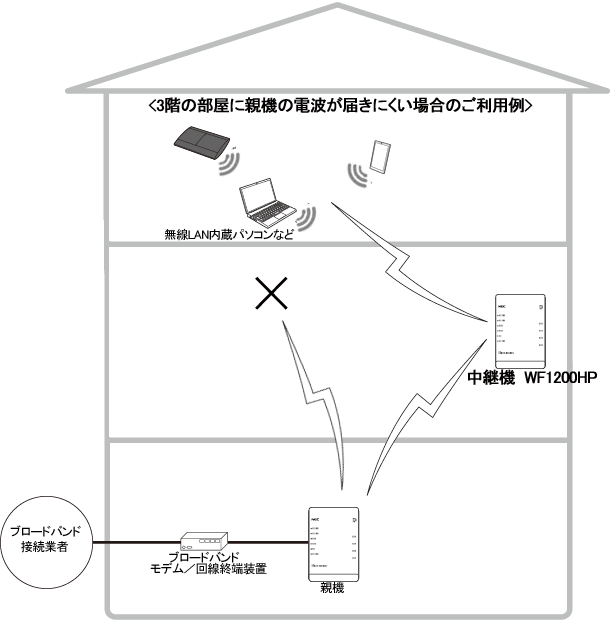 親機と子機間で電波が届かない場所でも、本商品を中継機として使用することで、電波が届くようになります。