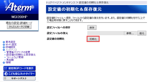 親機としてお使いの場合の画面を例に説明しています。Wi-Fiの子機/中継機としてお使いの場合も、同様の手順で初期化することができます。