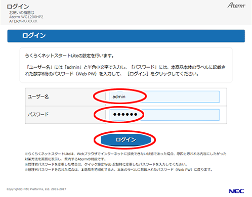 「ユーザー名」に「admin」を、「パスワード」に管理者パスワードを入力し、[ログイン]をクリックします。