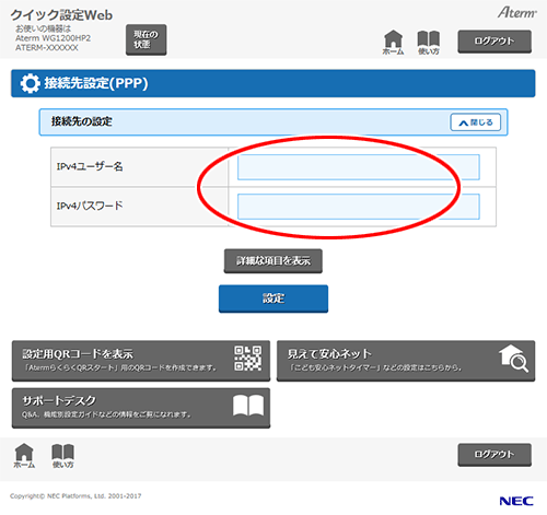 ※ フレッツの場合、「IPv4ユーザ-名」は@以下のプロバイダのアドレスまですべて入力してください。