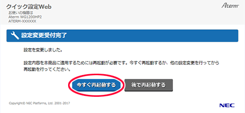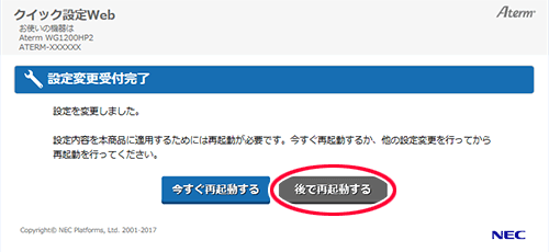 ※ 他に設定したい項目がある場合は[後で再起動する]をクリックしてください。