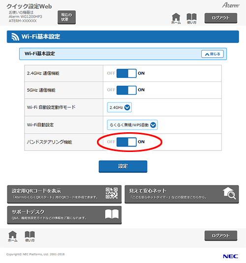本商品のバンドステアリング機能を有効に設定(工場出荷状態では無効)すると、子機を適切な周波数帯でWi-Fi通信できるように制御します。