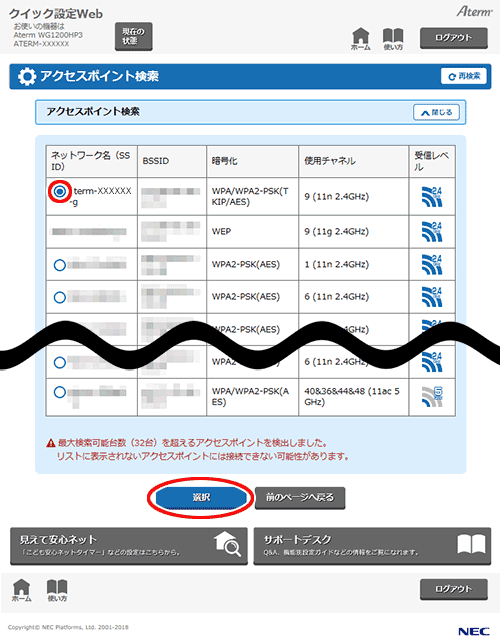 ※ 接続したい親機のネットワーク名(SSID)が表示されない場合は、親機に設定されているWi-Fiのステルス設定を解除してから、再度本設定を行ってください。