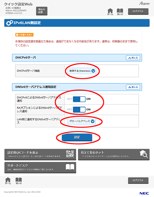 LAN側に通知するDNSv6サーバアドレスの種類を設定します。「グローバルアドレス」、「リンクローカルアドレス」から選択します。