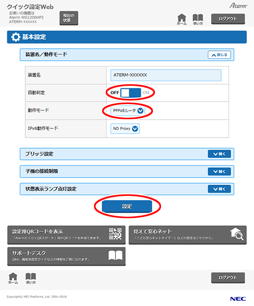 「自動判定」を「OFF」、「動作モード」で「PPPoEルータ」を選択して、[設定]をクリックします。