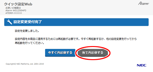 ※ 他に設定したい項目がある場合は[後で再起動する]をクリックしてください。