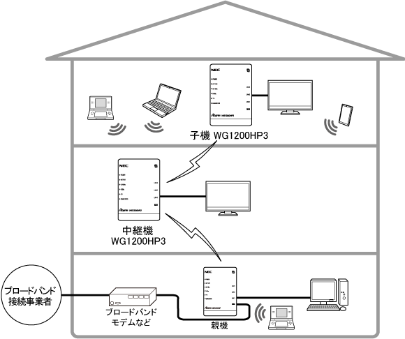 用途に応じた動作モードに設定することで、親機、中継機、または子機としてご使用いただくことができます。