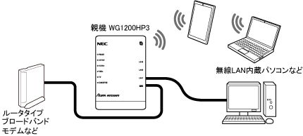 ルータタイプブロードバンドモデムにWi-Fi機能がない場合にもスマートフォンなどが接続できます。