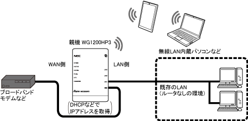 - 本商品のルータ機能を停止して利用するモードです。ルータまたはルータ機能内蔵のブロードバンドモデムなどに有線で接続するときに使用します。