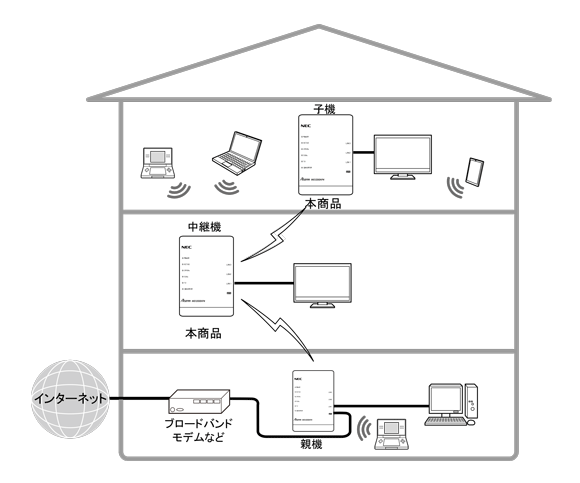 メッシュ中継機、メッシュ機能を利用しない中継機/子機については、「本商品の中継機能」を参照してください。