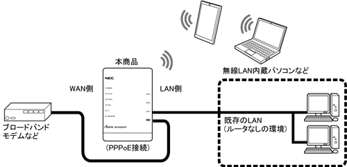 インターネット側のブロードバンド回線がPPPoE接続の場合、本商品をPPPoEルータモードに設定します。PPPoEルータモードでは、本商品自身がPPPoEでプロバイダ(または接続事業者)に接続するルータの役割を持ちます。