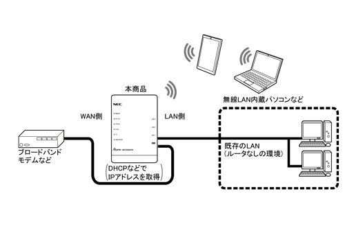 - 本商品のルータ機能を停止して利用するモードです。ルータまたはルータ機能内蔵のブロードバンドモデムなどに有線で接続するときに使用します。