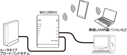 ルータタイプブロードバンドモデムにWi-Fi機能がない場合にもスマートフォンなどが接続できます。