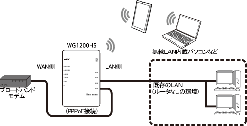 - インターネット側のブロードバンド回線がPPPoE接続の場合、本商品をPPPoEルータモードに設定します。PPPoEルータモードでは、本商品自身がPPPoEでプロバイダ(または接続事業者)に接続するルータの役割を持ちます