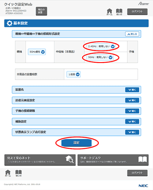 「親機⇔中継機⇔子機の接続形式設定」で中継機(本商品)と子機間の接続形式を、「2.4GHz:使用しない」、「5GHz:使用しない」に設定します。
