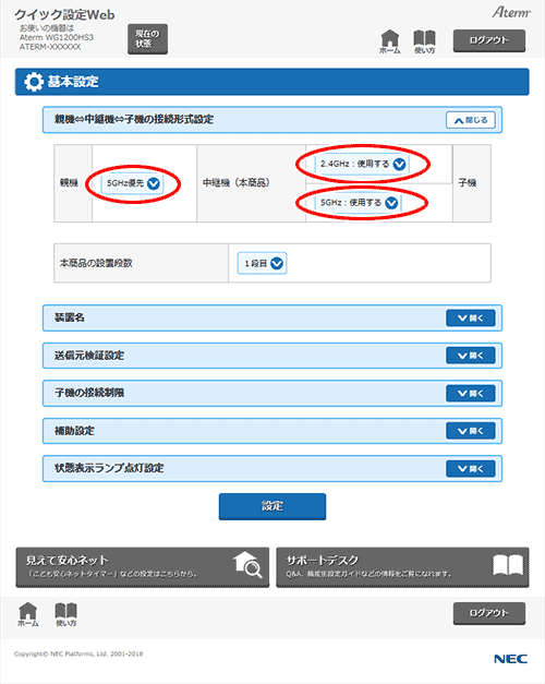 (※1) 親機と中継機(本商品)が、実際に「親機⇔中継機(本商品)」で設定した優先接続の周波数帯で接続された場合に、「中継機能」欄の中継機に設定されます。「親機⇔中継機(本商品)」に「5GHz優先」を設定しても、ご利用の環境や親機によっては、2.4GHz帯で接続される場合があります。 また、「2.4GHz優先」を設定しても、ご利用の環境や親機によっては、5GHz帯で接続される場合があります。