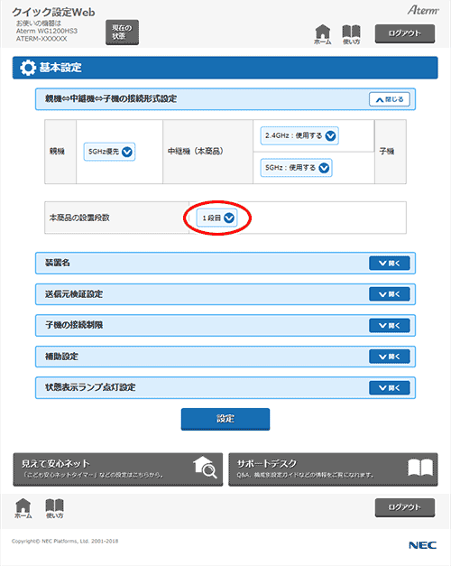 他の中継機と多段接続する場合、本商品を親機から何段目に設置するかを「本商品の設置段数」で設定します。