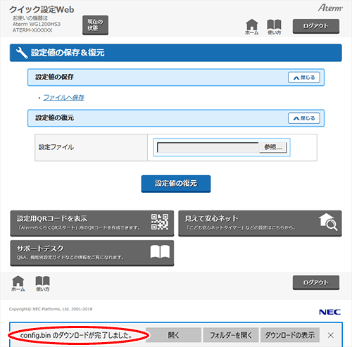 「ダウンロードが完了しました。」と表示されたら設定内容の保存は完了です。