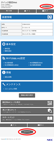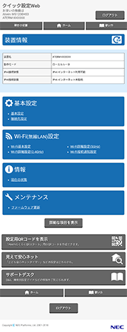 本商品の「クイック設定Web」のホーム画面が表示されます。