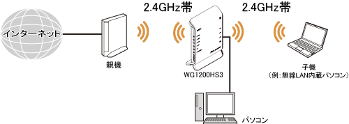 親機と中継機(本商品)間、中継機(本商品)と子機間ともに2.4GHz帯で通信します。