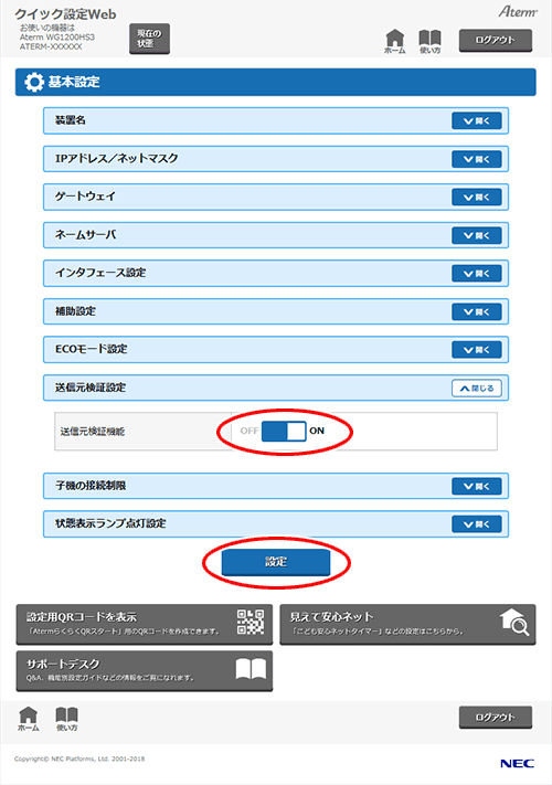 • 本商品が工場出荷状態または初期化後の状態ならば、送信元検証機能は「ON」に設定されています。本機能を使用する場合は、設定の必要はありません。
