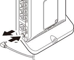 - 親機の側面にあるRESETスイッチを細い棒状のもの(電気を通さない材質のもの。つまようじの先など。)で押し続け、POWERランプが赤点滅を始めたら放す