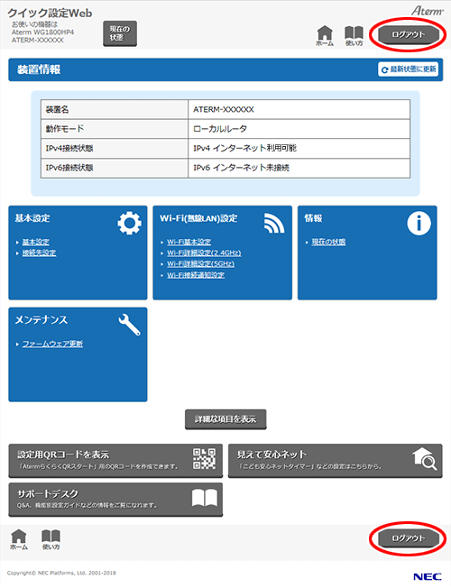 画面の説明は、「クイック設定Webの画面について」を参照してください。