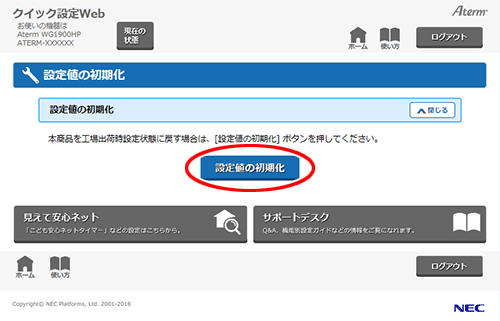 「メンテナンス」-「設定値の初期化」をクリックします。