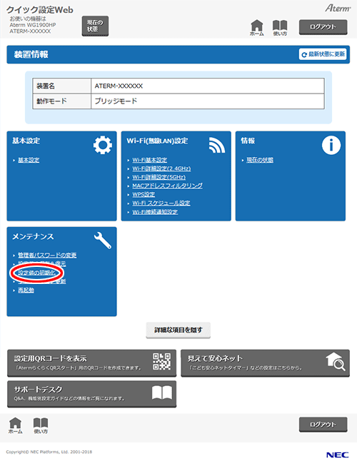 「メンテナンス」-「設定値の初期化」をクリックします。