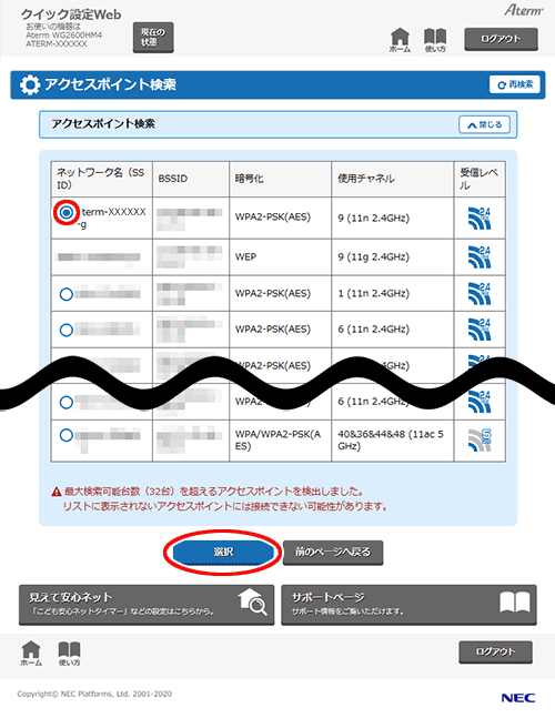 ※ 接続したい親機のネットワーク名(SSID)が表示されない場合は、親機に設定されているWi-Fiのステルス設定を解除してから、再度本設定を行ってください。